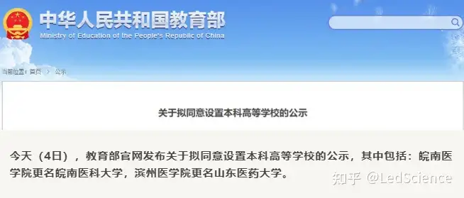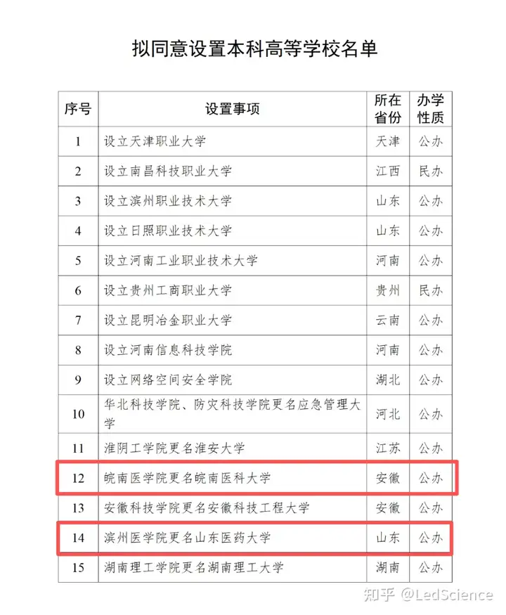 “医学界”注意到,公示名单第12、14位分别是“皖南医学院更名皖南医科大学”“滨州医学院更名山东医药大学”。公示期内如无意外,这两所医学院将正式更名为“大学”。